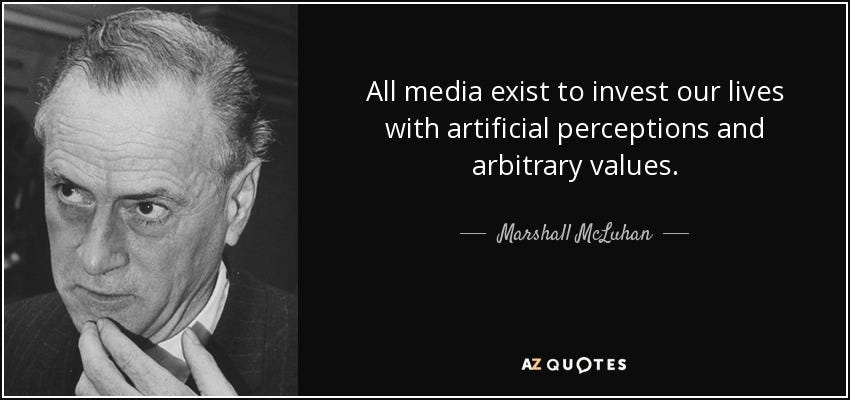 “Once we have surrendered our senses and nervous systems to the private manipulation of those who would try to benefit from taking a lease on our eyes and ears and nerves, we don't really have any rights left. Leasing our eyes and ears and nerves to commercial interests is like handing over the common speech to a private corporation, or like giving the earth's atmosphere to a company as a monopoly.” –Marshall McLuhan