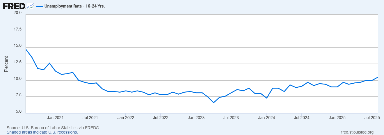 We are leaving young men in the dust. Youth Unemployment is at 10.5% right now, heading back toward Covid levels. Historically, when Youth Unemployment leads like this, it is a harbinger of some hard times to come as the overall employment environment starts to spin out of control. Youth Unemployment is a canary in a coalmine for general employment.